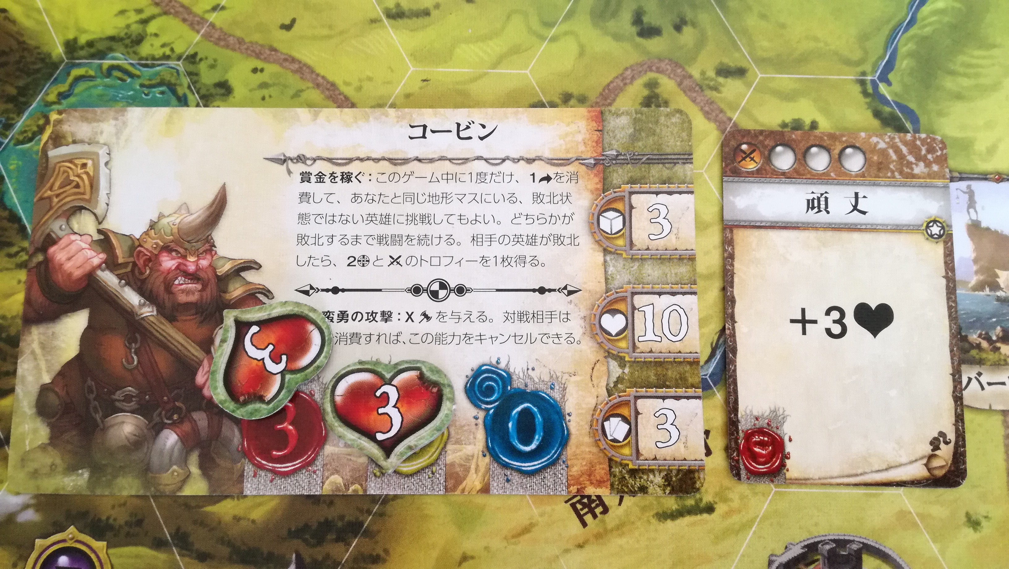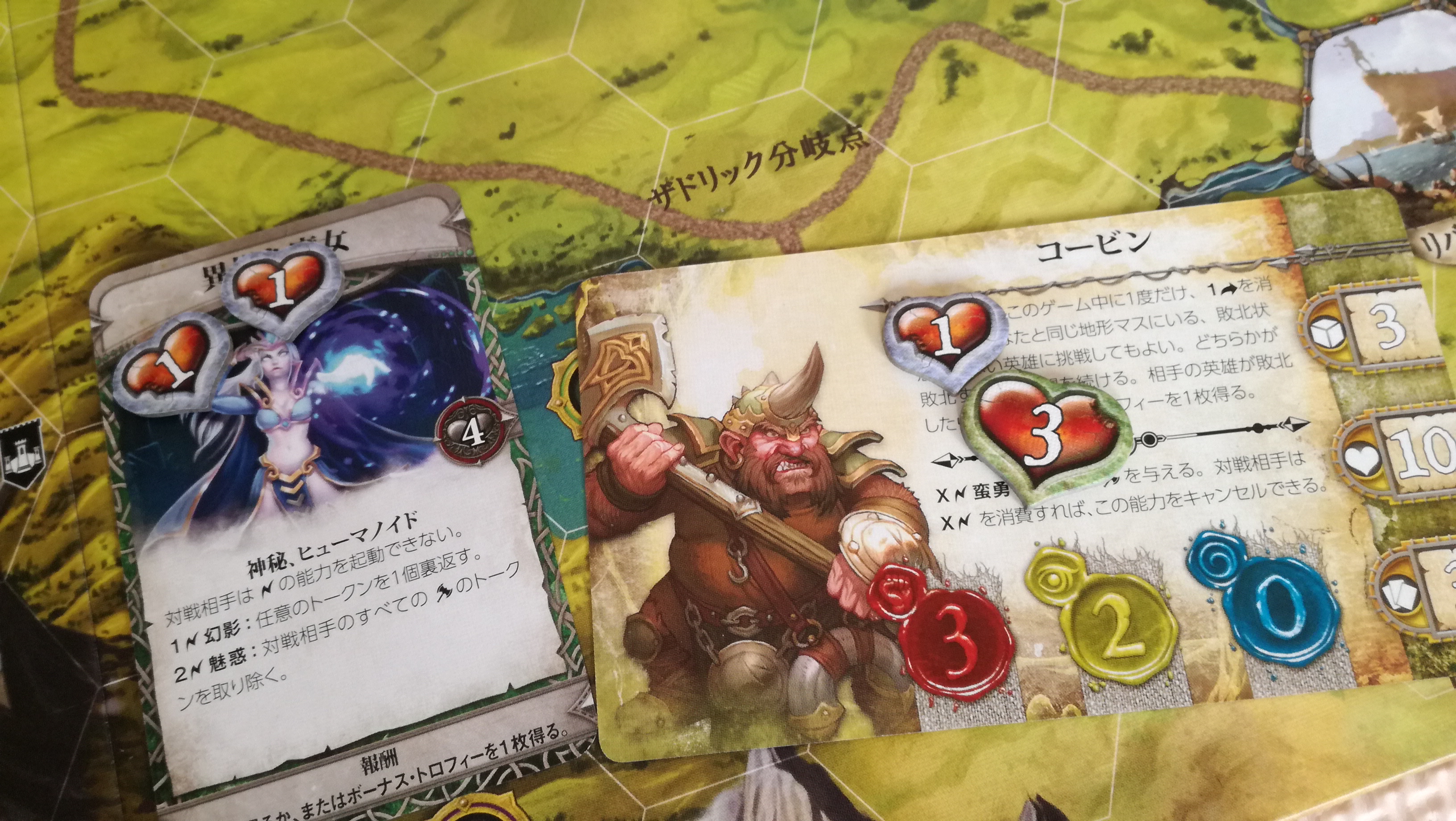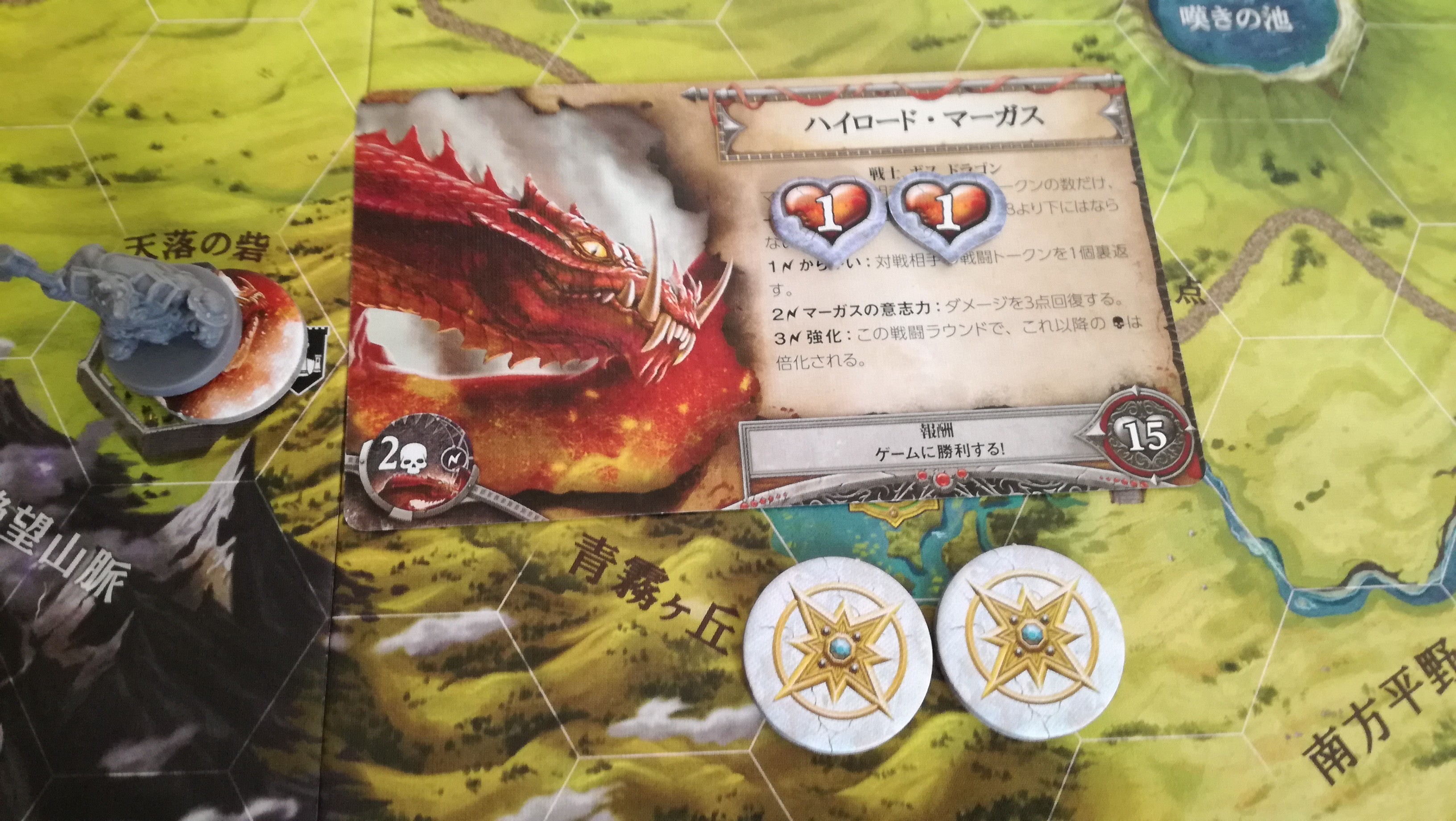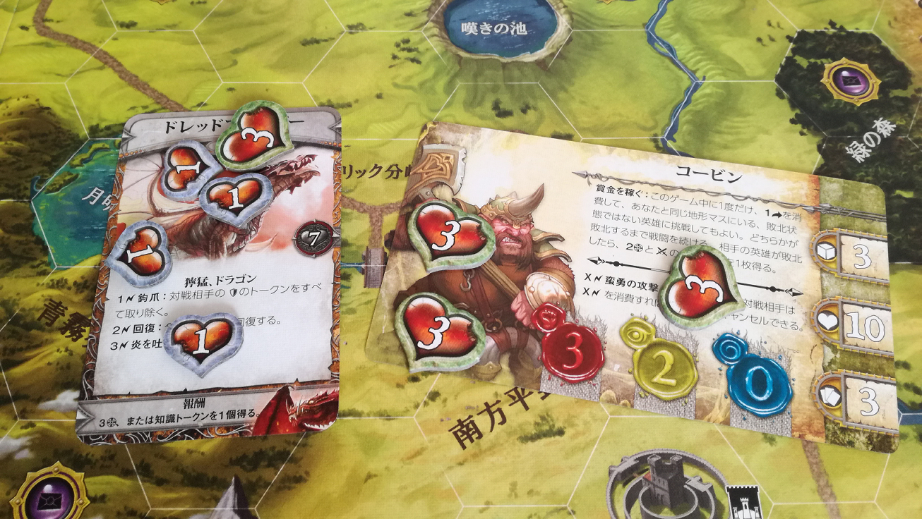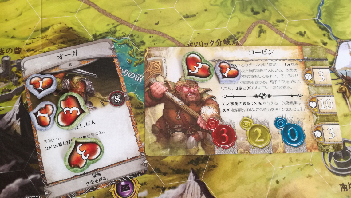 これも地味に勘違いさせる記述です。この『~回復することはできません』は、この戦闘中の事を指すのか?それとも戦闘が終わっても回復することなく、物語トークンの効果だけは累積するのか?。最初は後者と思い歓喜しましたが、よくよく考えると前者っぽいですね…残念。これもハウスルールで後者の物語トークンの効果は継続するようにすれば、協力というか駆け引きが加味されないかな~と思ったり。