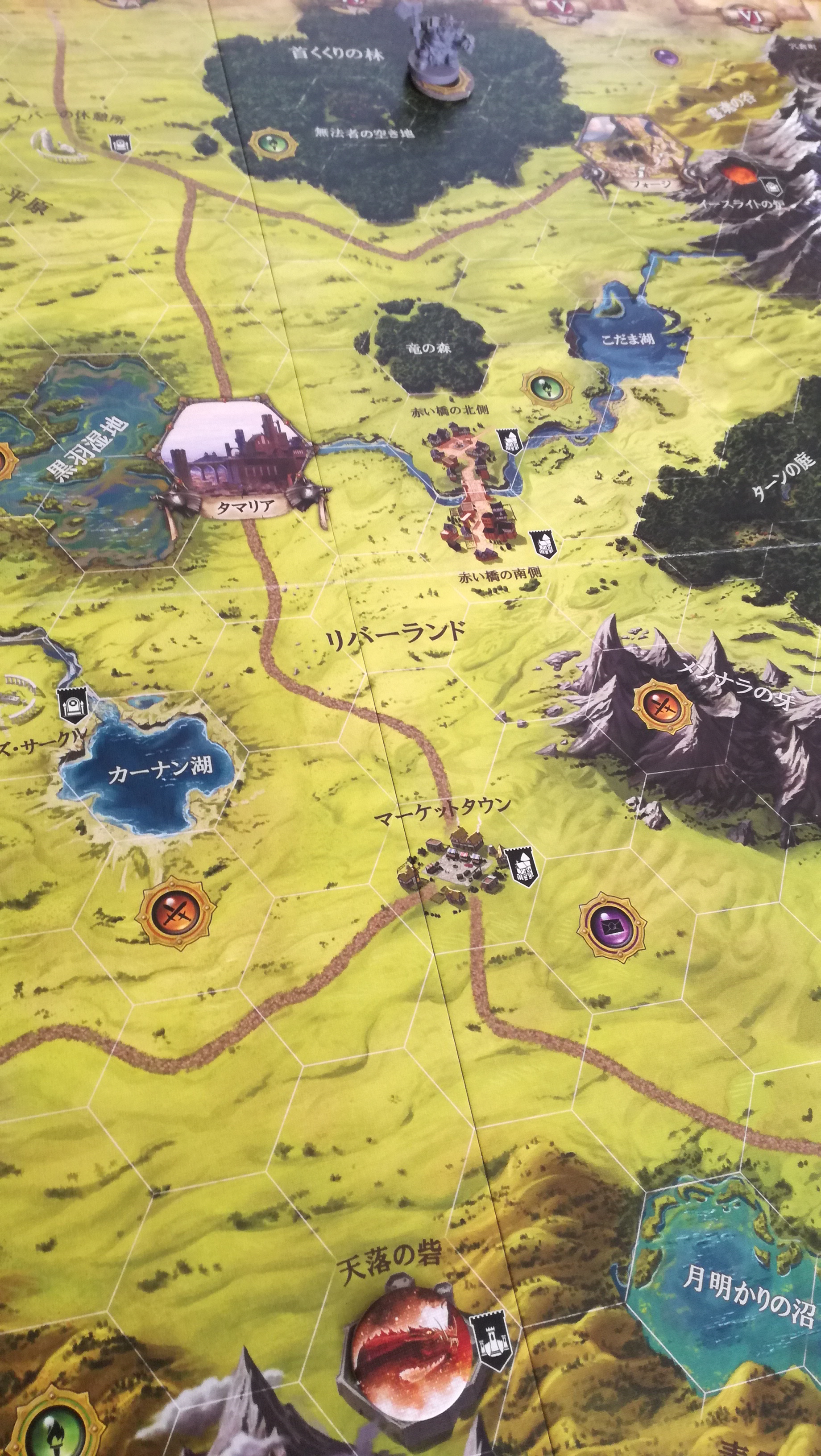 『道』での移動も、いくつか注意が必要です。道からつながった道への移動は都市同様にいかなる地形ダイスの出目でも移動が可能ですが、直接つながっていない道マスから道マスへの移動は背景に適応した地形ダイスの出目が必要となります。(該当する箇所は盤上2箇所ほどですタマリアの北と南にあるそれぞれの三叉路です。)